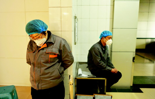 遗体火化是个重体力活,张凤莲(左)经常累得直不起腰来,只好在墙上靠一会儿。