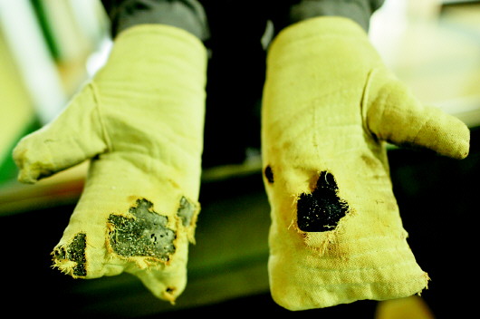刚出炉的炕面温度达到了100摄氏度,在上面捡拾骨灰时,特制的棉手套也难免被烧坏。