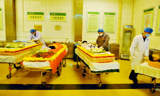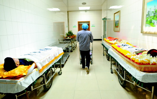 火化车间旁边的整容室忙不开时,张凤莲(中)也会过来帮忙。