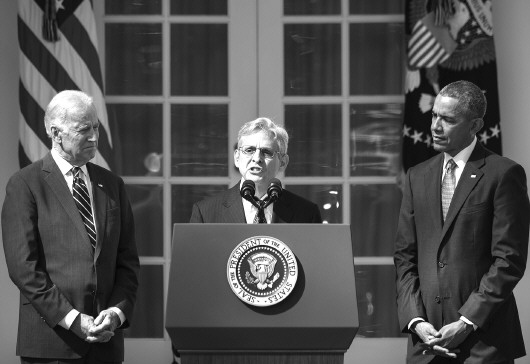 16日,在美国华盛顿白宫,哥伦比亚特区上诉法院法官梅里克·加兰(中)发表讲话,美国总统奥巴马(右)与副总统拜登在一旁聆听。 新华/法新