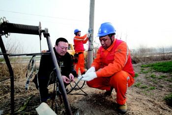 3月16日,国网德州供电公司共产党员服务队工作人员来到七西村麦田中,为村民们检查春灌用电线路、设备,保证春灌期间的可靠供电。