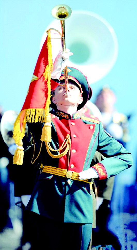5月9日,俄罗斯红场阅兵时的一位俄军小号手。