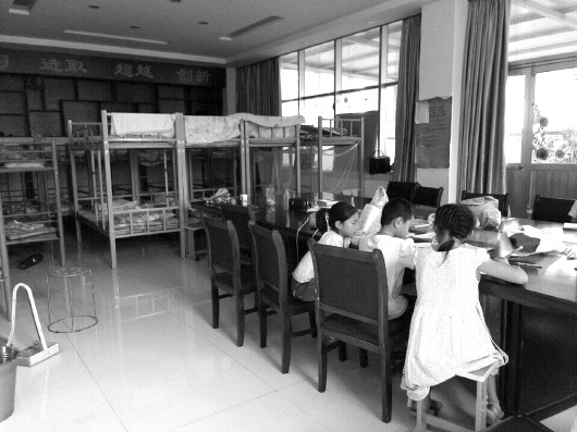 8月2日,物业办的暑期托管班里,小学生在做作业。