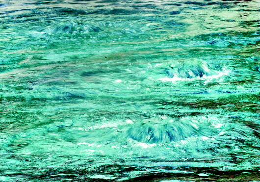 3日下午,记者在趵突泉泉池前看到,三股水喷涌十分有力,喷涌向上的泉水形成一个个水轮,在泉眼周边形成大的涟漪,三股水的涟漪相互交叉,远看在泉池中间形成一大片水景,喷涌浩荡。