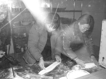 陈红(左)和魏志静(右)一块给战士们做手擀面。