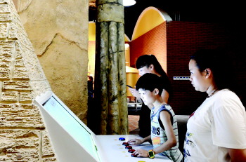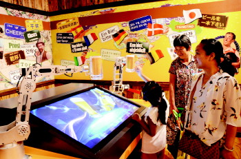 ▲在啤酒文化博物馆内,干杯机器人受到小朋友的欢迎。