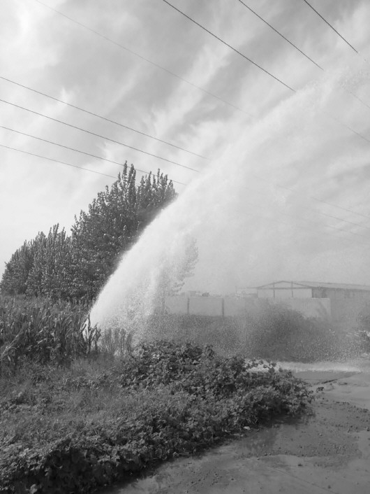 管道被钻破之后,水都喷到了近十米高的电线上。(受访者供图)