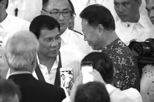 ◥今年8月,杜特尔特(左)和中国驻菲大使赵鉴华见面。