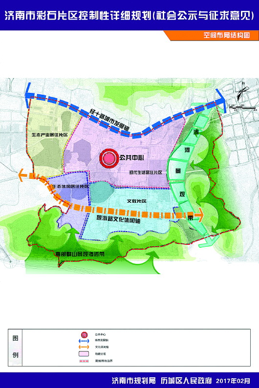 根据控规,彩石片区将规划形成“一心、两轴、两带、四片区”的布局结构。以北寺山公园及周边的文化、商业用地为本片区的核心,以经十东路和旅游路为发展轴线;沿南部山体和西巨野河构建山水景观带,形成西北部生态产业居住片区、中东部现代生活居住片区、西南部生态休闲居住片区和东南部的文教片区。