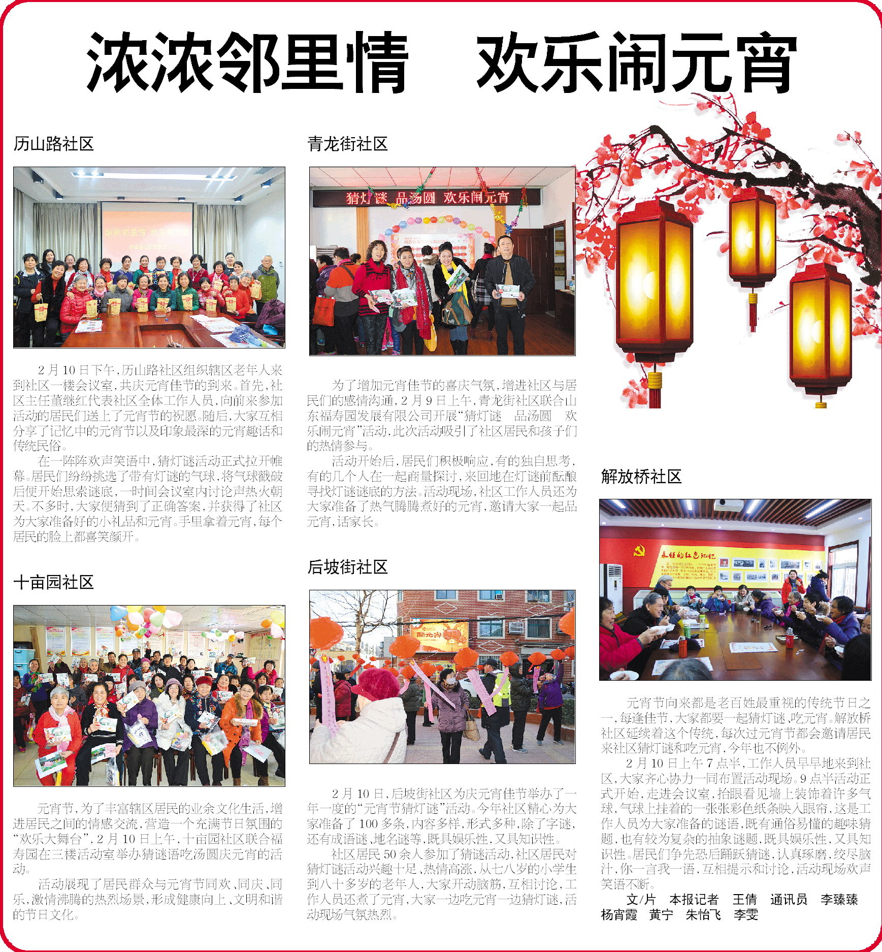 为了增加元宵佳节的喜庆气氛,增进社区与居民们的感情沟通,2月9日上午,青龙街社区联合山东福寿园发展有限公司开展“猜灯谜 品汤圆 欢乐闹元宵”活动,此次活动吸引了社区居民和孩子们的热情参与。