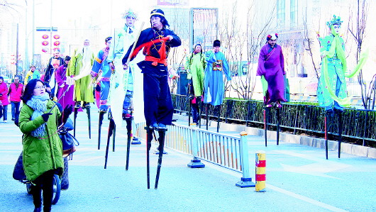 喜庆的锣鼓敲起来,欢快的秧歌舞起来,热闹的高跷踩起来……9日上午,在济南历山路上,来自东舍坊高跷艺术团的40多名演员踩着高跷、舞着大秧歌、敲着欢乐的锣鼓进行踩街表演,用传统形式为市民拜大年,与大家一起闹元宵。
