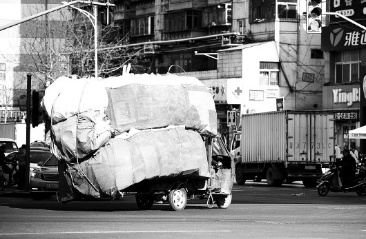 近日,在济南街头,一辆电动三轮车严重超载。 本报记者 左庆 摄