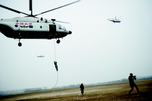 往上看,一台直升机正悬停在离地十几米的空中。“呼——”半空中,侧舱门忽然打开,绳索抛下,一名头戴凯夫拉头盔、身着绿色迷彩、穿防弹背心的武警特战员沿绳索从天而降,迅疾如一道闪电,照亮黄昏的天空。一个接一个,十几秒的时间,9名特战员已完成索降着陆,呈扇形排开,单膝跪地,手托钢枪,目光如鹰隼瞄准前方狙击目标。完成人员输送后,这台直升机如大雁展翅,缓缓升高,飞向远方天际。