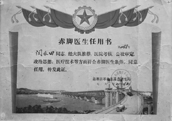 据了解,这张任用书长38.5厘米,宽26.5厘米,编号为“第1188号”。正文为“闫家田同志,经大队推荐,医院考核,公社审定,政治思想、医疗技术等方面符合赤脚医生条件,同意任用,特发此证。落款为“益都县革命委员会卫生局”,时间为“七九年四月廿五日”。