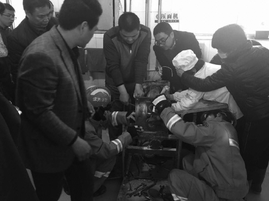 16时37分,压面机滚轴被成功拆除,该女子手指被顺利救出,并被食堂其他员工送往医院进行救治。