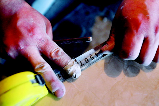 刚开始干的时候,朱红岩的手和脚都累肿了,手指肿得像胡萝卜。粗线条的徐锐很是心疼,但嘴上却说:“没事,我刚干的时候手也是肿的。”这让朱红岩哭笑不得。自从俩人搭档以后,“斗嘴”成为他们单调的贴砖生活的调味品。比如有时候朱红岩想休息,徐锐就说:我就你这一个小工,你走了我指挥谁?嘴上这样说着,活儿却自己全干了。