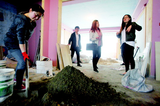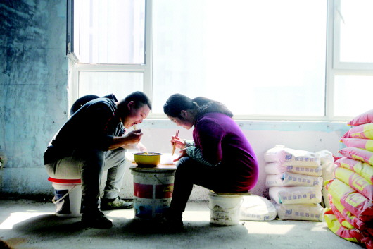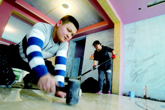 4月6日,在济南槐荫区一小区的装修现场,朱红岩抄着跟她个头差不多高的铁锹熟练地和着沙泥,丈夫徐锐拿着橡胶皮锤和米尺,不停地敲击着刚铺上的地板砖。在“哒哒”的敲击声中,他俩一边聊天,一边各自忙活着。