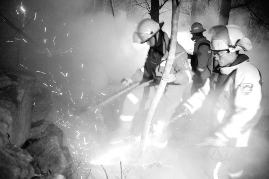 ◥泰山发生山火,赵振国(右一)战斗在第一线。