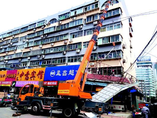 十亩园社区,一辆吊车正将拆掉的广告牌、铁架子从楼顶运到地面。 本报记者 王倩 摄