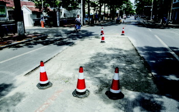 魏德敬是济宁市市政工程处道路养护所本路段现场负责人。“像这种龟裂的和下陷的道路就要重修,过段时间就会翻浆。如果今年不修,到了明年就是大坑。”在红星路百花公园西侧的一处路面,魏德敬说。