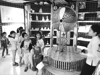 在展馆讲解员的引领下,孩子和家长们来到北展厅,这里收藏有历史上不同时期的济宁地区土壤样本。而色彩艳丽的鲁锦、老码头的木箱、竹竿巷的箩筐,华丽巨大的绣球,还有精致的葫芦雕刻,让孩子们仿佛置身于百年前的老济宁城里。