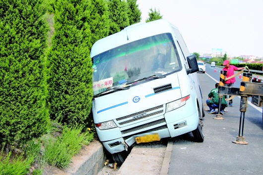 15日13时57分,威青高速青岛方向79.6公里处,一辆行驶中的客车突然偏离车道,跨过应急车道后冲进路边约一米宽的排水沟,两个右车轮陷入沟内,左侧车轮还在路上。速度较快,惯性也大,这辆客车竟斜着向前滑行20多米,连着撞断3棵绿化松树才停了下来。