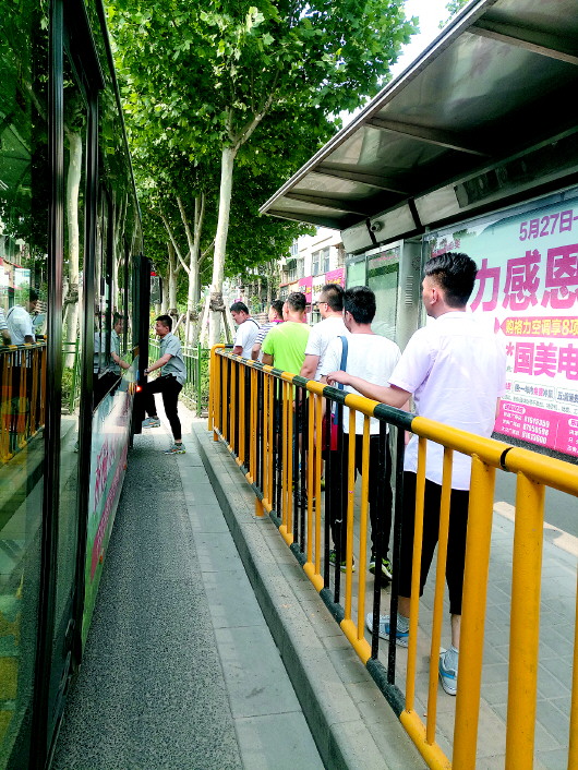 5月31日,济南大学站点设置了护栏,市民排队上车。