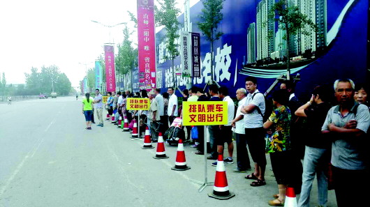 从“人和”看,一方面是车队和志愿者的引导,另一方面是乘客养成了的排队意识。同时,驾驶员不能乱停在队伍中间。