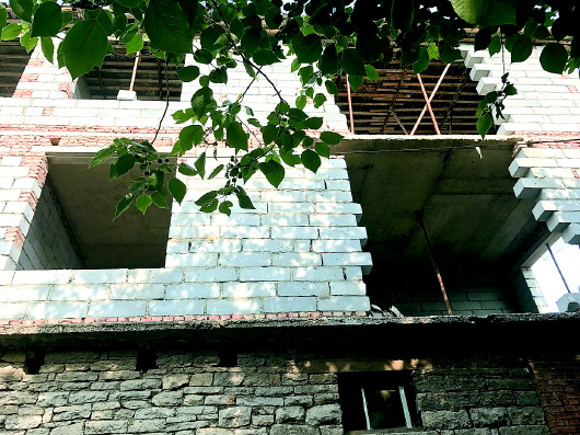 不少人家的加盖工程尚未完工,门口堆着木头、黄沙、空心砖等建材。从裸露的建筑来看,加盖工程过分简单——只是在原有平房基础上,摞积木似的往上摞,穿过二楼门窗处,可以清楚地看到,施工人员只是用立柱顶住,用于支撑加盖楼层地面。而房屋外部未见任何脚手架与防护措施。