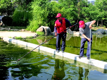社区志愿者清理小区的景观河。
