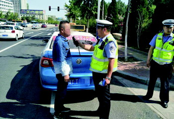 5月26日早晨8时48分许,一辆牌号鲁Y开头的出租车沿观海路行驶,因车辆未年审致交通指挥系统报警,执法人员很快在观海路迟家路口将其拦停。