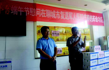 聊城市复退军人医院、莱商银行、聊城市佳科达商贸有限公司领导参加活动,为在院疗养的优抚军人送上了名牌粽子30余箱、矿泉水50箱、水果篮、鸡蛋数箱、小扇子、衣服等慰问品。聊城市复退军人医院副院长时长忠在欢迎词中说,医院每年在全市各县市区收治复退军人优抚对象600余人次,住院床日20余万床日,为做好全市拥军优属工作,地方支援部队建设,稳定军心,做出了应有的贡献;同时面向社会开放,服务于全市人民,受到市委、政府及广大人民的赞誉和信赖。在互动活动中,老军人们唱了《打靶归来》、《我是一个兵》《三大纪律八项注意》等军歌,对慰问单位表示了热烈欢迎。