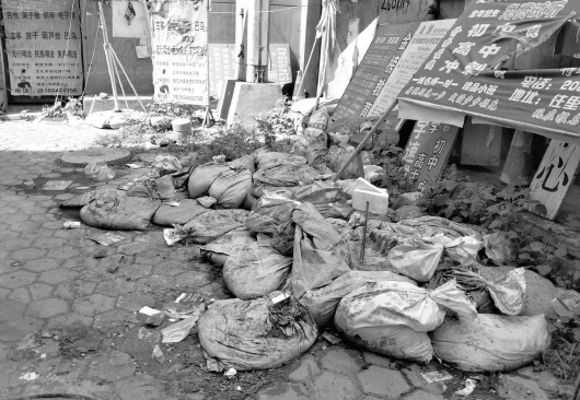 5月31日下午,记者来到文化市场,在市场东北角记者看到该垃圾堆,20余袋散装的淤泥错乱排放,远远的都能闻到一股腥臭味。袋子内渗出黑色污水清晰可见,不时有市民经过,掩鼻而行。