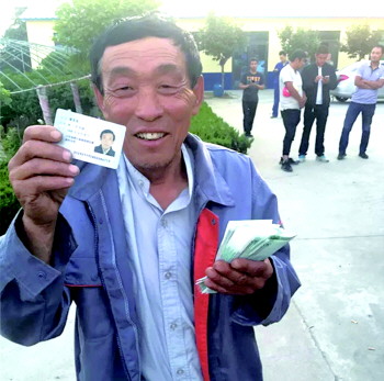 农民工领到工资后,喜笑颜开。