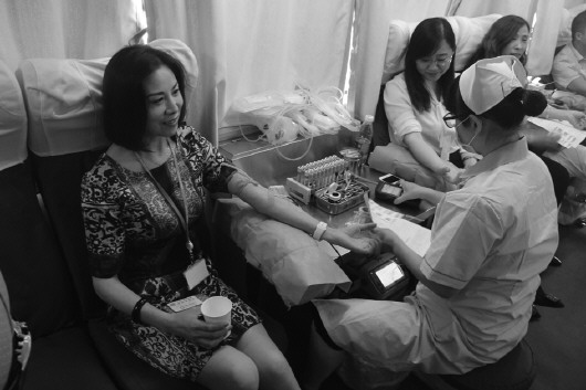 一位位精神奕奕的平安青年员工排好队伍登上采血车,撸起衣袖,在医务人员的专业操作下,进行检测、采血,在采血中互相鼓劲。