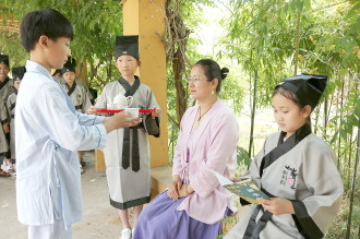 弘扬传统文化迎“六一” 来源:齐鲁晚报 2017年06月01日 30日,枣庄市光明路街道雷村国学堂的孩子们身着传统服饰,通过诵读国学经典、学传统礼仪、包粽子等形式,弘扬中华优秀传统文化,迎接“六一”国际儿童节。图为,雷村国学堂的老师和孩子们表演自编的情景剧《敬茶》。 本报通讯员 吉吉吉 耿德刚 摄影报道 本稿件所含文字、图片和音视频资料,版权均属齐鲁晚报所有,任何媒体、网站或个人未经授权不得转载,违者将依法追究责任。