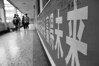 嘉祥一中校园悬挂的鼓劲条幅。 本报记者 马辉 摄