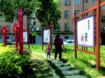 “仁、义、礼、智、信,牛牛,知道这5个大字是什么意思吗?”社区的文体广场改造后,居民陈阿姨每天都会带着3岁的孙子牛牛过来转转。“这些宣传栏里的图片讲得啥故事,他有些能记住了,天天带他过来看看,孩子知道了不少道理。”