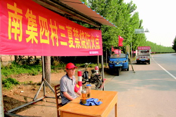 在防火点,除了一个用来遮阳的防火棚,沿兖微路自南向北,防火棚一百米开外的道路两侧就都悬挂着关于“秸秆禁烧”的防火标语。铁锨、笤帚……这些拿过来就能用的简易没货设备也放在了伸手可得的防火棚外,除了村里配备的宣传车,防火员们还从家里骑来了自己的电动车,绑上“禁烧巡查”的大红条幅,在村间地头巡查。