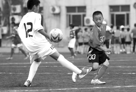 穿上足球服的小朋友,踢起球来有模有样。本报记者 王鸿光 摄