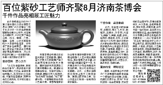 由齐鲁晚报主办的2017第12届中国北方茶业博览交易会(简称“北方茶博会”)将于本月18日—21日在济南舜耕国际会展中心举行。本届展会为期四天,不仅汇聚了来自云南、四川、湖南、广西、福建、台湾、山东日照等地的六大茶类特色茗茶,还特设了紫砂名家展区,届时将有上百位宜兴紫砂工艺师携紫砂精品亮相现场,为山东的壶友们献上一场品鉴收藏、乐趣十足的紫砂艺术节!