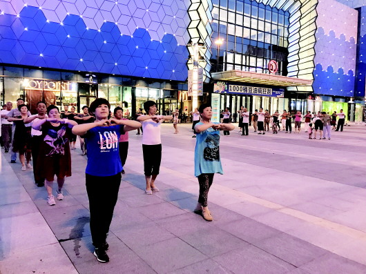 8月8日晚,广场舞爱好者在滨州万达广场外跳起广场舞。 本报记者 张爽 摄