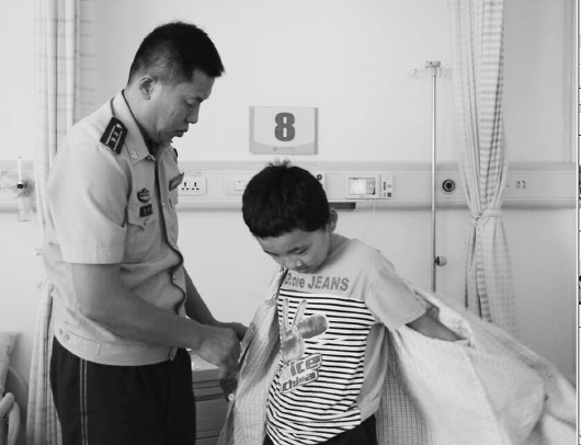 8日上午10点,12岁的成宝穿着一身条纹病号服,在病床前坐立不安,焦急地等待着出院通知。济宁市消防支队党员服务队成员张奎杰办理出院手续,一颗颗地帮他解下病号服的扣子。成宝身体有些虚弱,张奎杰将他从病床上抱下来,用手掌拍了拍成宝的肩膀,嘱咐他要好好学习。病床前还放着张奎杰给成宝的礼物,书包、本子、助学金……