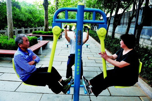 7日下午,在阳光100小区健身房里,很多老人正在这里健身。张守成和李玉珍两老口在乒乓球室内对战,随着乒乓球一来一往,两位老人你进我退,打得非常认真。而与之相邻的几个乒乓球室内,正在打球的也多是老年人。