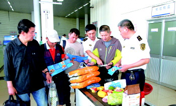 检验检疫人员向中韩班轮旅客展示截获的禁止进境物,并进行检验检疫法规知识宣传。