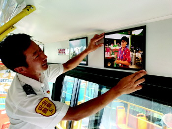 8月9日上午,在胡建波驾驶的209路公交车的车厢里,浓浓的啤酒节氛围迎面而来。车厢两侧贴满了关于啤酒节的照片,有啤酒节会场内五光十色的夜景、啤酒大棚内举杯畅饮的欢快,也有白天啤酒城内的宁静。车厢内的手拉宝里也插入了啤酒节的照片,可方便乘客多方面欣赏照片,