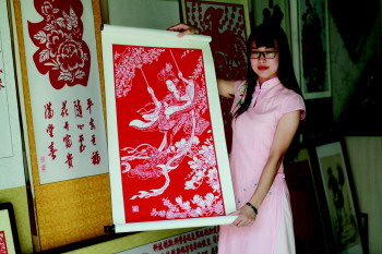 出生于1996年的胶州小高欢欢看起来比同龄人要成熟一些,高高的个子,雅致的旗袍,再配上琳琅满目的剪纸,高欢欢很有古典气息。“我一出生就活在剪纸的世界里,所以我从小就爱好。”高欢欢说,从她96岁的太姥姥陈郑氏开始,到姥姥陈秀美、妈妈李秀君,三代人都是剪纸技艺的拥趸,尤其是姥姥陈秀美对于剪纸的狂热已经达到了痴迷的地步。在高欢欢刚刚有记忆的时候,她记住的就全是姥姥的剪纸。“小动物、窗花、名人字画,姥姥什么都剪,而且都特别好看。”高欢欢说,那时候姥姥是远近闻名的剪纸达人,周围的邻居逢年过节都要来求一幅剪纸,这让年幼的高欢欢对剪纸技术和姥姥充满了膜拜感。