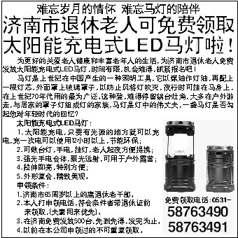 为更好的关爱老人健康和丰富老年人的生活,为济南市退休老人免费发放太阳能充电式LED马灯,时间有限,机会难得,抓紧报名吧!