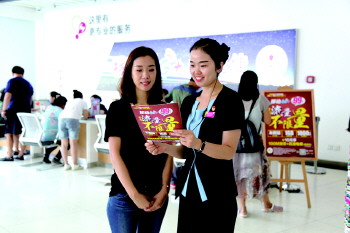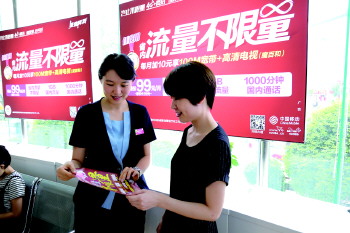 山东移动营业人员向市民介绍省内流量不限量套餐。