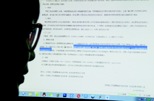 按照秦女士提供的信息,记者在东阿政务网及东阿新闻网均找到了“东阿县公开招聘南湖行知学校第一批派驻教师简章”。简章是在8月20日由东阿县公开招聘南湖行知学校第一批派驻教师领导小组对外发布的,从8月27日开始已通过网络接受报名,招聘流程也是采取政府公开招聘的形式进行。